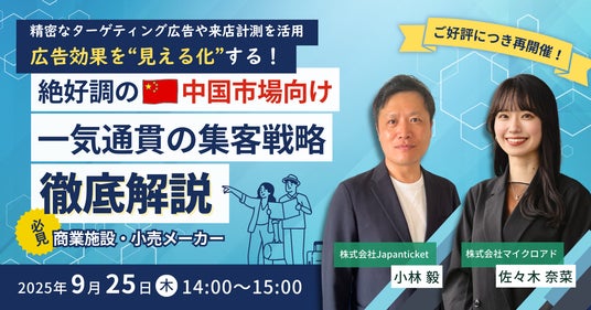インバウンド集客向けeチケット管理システム「Japan ticket」を運営する株式会社Japanticket(本社:東京都渋谷区、代表取締役:田中宏彰、以下、Japanticket)は、2025年9月25日(木)、商業施設や小売メーカーといった事業者向けに、中国市場向けの集客戦略をテーマとしたオンラインセミナーを開催いたします。