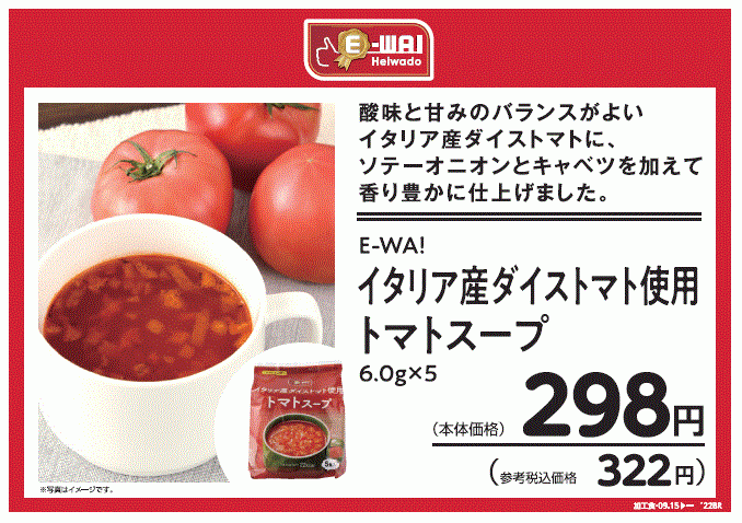 株式会社平和堂(本社:滋賀県彦根市、代表取締役社長執行役員:平松正嗣)は、平和堂こだわりブランドE-WA!の新商品として、「イタリア産ダイストマト使用トマトスープ」を、2022年9月16日(金)より平和堂・エールの158店舗で新発売いたします。