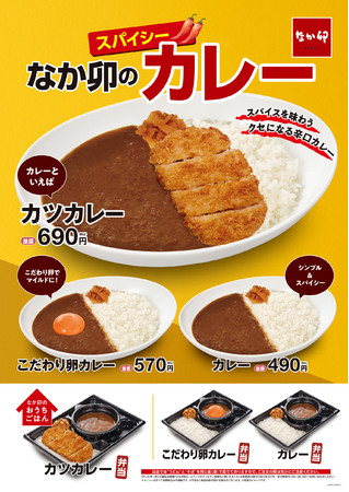 なか卯のカレーは30種類以上のスパイスを使用しています。今回、スパイスの配合を見直し、なか卯初のスパイシーで辛口なカレーに仕上げました。口に入れた瞬間に広がるスパイスの香りとクセになる辛さが食欲をそそります。やわらかい特製のロースカツをのせた定番の「カツカレー」と、なか卯自慢の“こだわり卵”をのせた「こだわり卵カレー」もご用意しています。鶏を育てる飼料からこだわったなか卯の“こだわり卵”は、一般的な卵よりも弾力とコクがあり濃厚で、辛口のカレーにからめれば、まろやかかつスパイシーな後を引くおいしさをご堪能いただけます。また、チーズや鶏唐(とりから)などをトッピングし自分好みのオリジナルカレーをお楽しみいただくことも可能です。