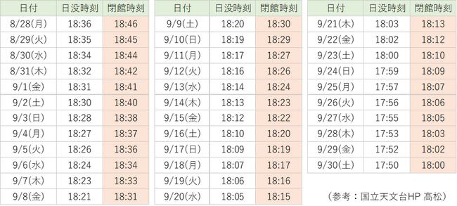 当館は瀬戸内海に隣接しており、暑さが少しずつ和らいでくる秋は、夕景のベストシーズンとなります。皆さまに少しでも長い時間、美しい景色を楽しんでいただきたいと思い、通常は18時閉館のところ、日没10分後まで、営業時間を延長します。
