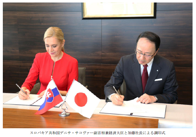 2月9日(金)、当社東京本社にて調印式を執り行いました。スロバキア共和国からはデニサ・サコヴァー副首相兼経済大臣を含む2名の閣僚が出席、当社からは社長の加藤をはじめ、開発分野の幹部が出席しました。