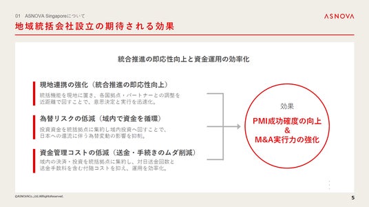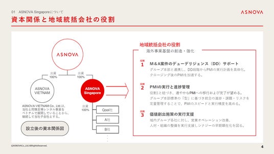 ASNOVA Singaporeは100%出資子会社となる予定です。地域統括会社の役割は大きく3つ。