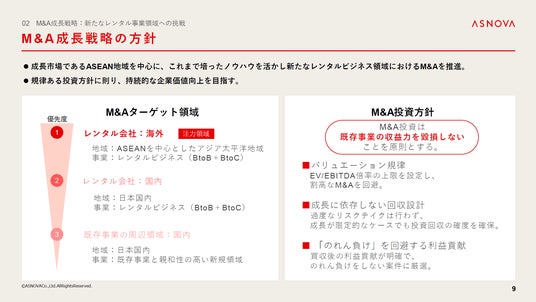 今後は、ASNOVA強みを活かしながら、レンタルビジネス領域におけるM&Aを主として積極的に挑戦してまいります。また、BtoCの領域も視野にいれながら扱う商材や地域も大きく広げていき、規律ある投資方針に則り、持続的な企業の向上を目指します。