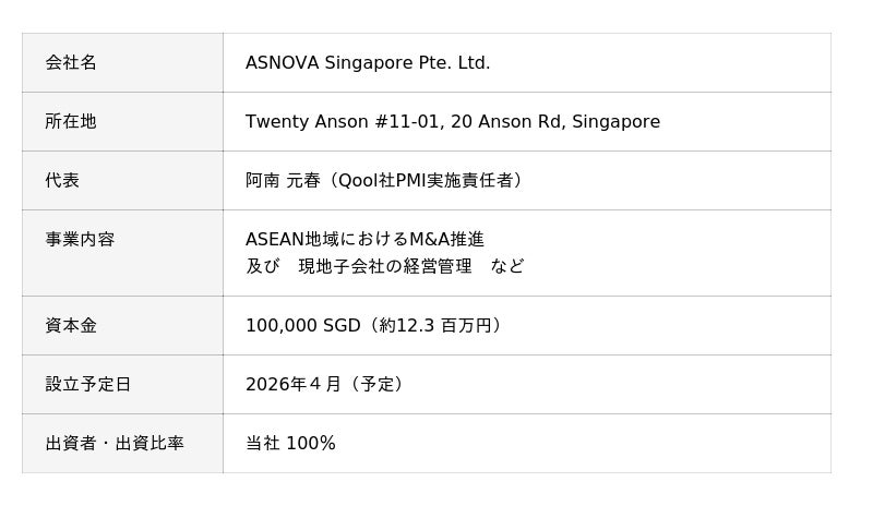 くさび式足場のレンタル・販売を提供する株式会社 ASNOVA(本社所在地:愛知県名古屋市、代表取締役社長 上田桂司、以下「当社」)は2026年3月13日(金)の取締役会において、ASEAN地域でのM&A加速を主たる目的とした、地域統括会社「ASNOVA Singapore」を設立することを決議いたしましたのでお知らせいたします。