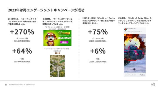 人気モバイルエバーグリーンゲームは独創的な広告クリエイティブで旧ユーザーを呼び戻し、安定したユーザーアクティビティを保っています。『ガーデンスケイプ』は、2023年4月に旧ユーザーに訴えかける広告クリエイティブを大量に出稿し、ダウンロード数および収益を前年同期からそれぞれ270%および64%増加させることに成功しました。