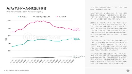 ユーザー獲得コストが増加し続ける市場環境において、モバイルゲーム業界はカジュアルゲーマーの変化に直面しており、モバイルゲームの「カジュアル化」の傾向がいっそう顕著なものになっています。2023年第4四半期に、ミッドコアゲームの世界収益が前年同期から9%減少したのに対し、『MONOPOLY GO!』や『ロイヤルマッチ』などのようにプレイ方法がより簡単なカジュアルゲームの収益が前年同期から8%増加し、ハイパーカジュアルゲームおよびミッドコアゲームのプレイ方法とマネタイズ手法を融合させたモバイルハイブリッドカジュアルゲームにいたっては収益が前年同期比30%増と大きく増加しました。