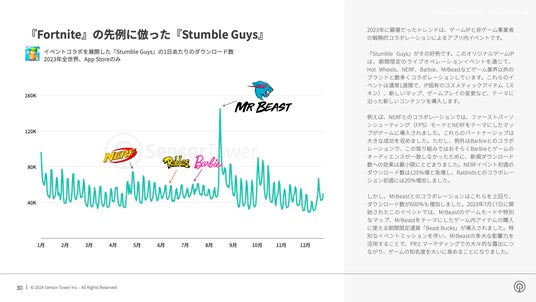 2023年は、ゲームIPと非ゲーム実在ブランドの業界を超えたコラボレーションによるアプリ内イベントの実施がゲーム運営の新たなトレンドとなりました。『Stumble Guys』はその典型的なケースであり、オリジナルのゲームIPがHot Wheels、NERF、Rabbids、Barbie、MrBeastなどのブランドと提携し、特定の新しいアイテム、スキン、マップおよびゲームモードをリリースしました。中でもMrBeastとのコラボレーションはずば抜けて効果が高く、ダウンロード数を600%増加させました。