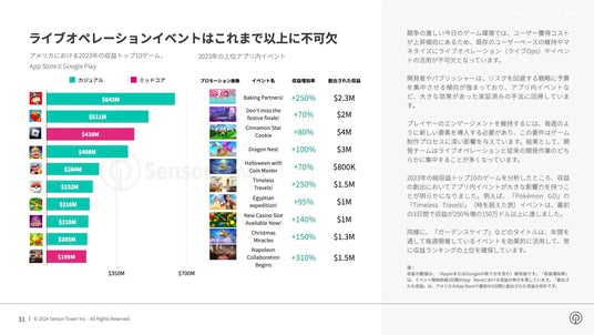 ユーザー獲得コストが高止まりする状況において、ライブオペレーションによる既存ユーザーの引き留めおよびマネタイズが極めて重要になっています。『MONOPOLY GO!』の「Baking Partners!」イベントおよび『Pokemon GO』の「時を超えた旅」イベントは、最初の3日間でモバイルゲーム収益を250%増加させ、それぞれ230万ドルおよび150万ドル以上の収益を上げました。