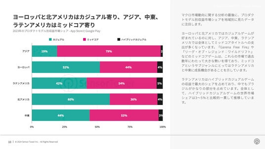 ヨーロッパ地域および北アメリカ地域のモバイルゲームプレイヤーはカジュアルゲームを好んでいるのに対し、アジア地域においてはミッドコアゲームに対する支出がモバイルゲーム支出の79%を占めており、このことが収益が減少した主な原因になっています。中東地域およびラテンアメリカ地域においては、ミッドコアゲームに対する支出が全体の53%前後を占めており、『Free Fire』や『リーグ・オブ・レジェンド:ワイルドリフト』などのミッドコアゲームに成長のチャンスを提供していました。