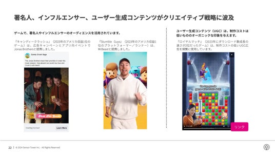 著名人、インフルエンサー、ユーザー生成コンテンツ(UGC)を利用した広告クリエイティブでプレイヤーとの距離を近づけることがモバイルゲーム広告マーケティングにおいて人気の戦略になっています。『キャンディークラッシュ』は、2023年5月にゲームミュージックフェスにおいてアメリカのロックバンドのJonas Brothersとコラボレーションしてライブオペレーションの実施および広告クリエイティブの出稿を行い、プレイヤーのダウンロード・課金を促しました。実在人物がゲームのプレイ方法を披露するUGC広告クリエイティブは、低コストとオーガニックトラフィック既視感の強みを兼ね備えており、同様に広く用いられています。