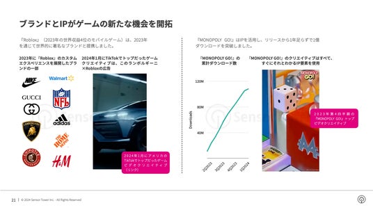 ゲーム自身のIPの利用または他のIPとのコラボレーションは、すでに人気広告クリエイティブの重要な戦略になっています。2023年の世界のモバイルゲーム収益第3位の『Roblox』を例に挙げると、ナイキやグッチなどの多数の世界の有名ブランドと提携して知名度およびユーザー数を高めています。『MONOPOLY GO!』においては、ほぼすべての広告クリエイティブにおいてモノポリーIPを重点的に強調しており、リリースから1年足らずでダウンロード数が1億を超えています。
