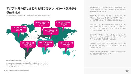 世界のモバイルゲーム総収益は2%減少しましたが、各地域の傾向はそれぞれに異なっています。中東地域においては、『ホワイトアウト・サバイバル』や『Rise of Kingdoms』などのストラテジー ゲームが際立つ実績を残したことを受け、モバイルゲームの収益が8%増加しました。ヨーロッパ地域においてはダウンロード数が12%減少しましたが、収益は7%増加し、『キャンディークラッシュ』や『ガーデンスケイプ』などのカジュアルパズルゲームが成長の主力になっています。ラテンアメリカ地域においては、『Call of Duty(R): Mobile』や『Free Fire』などのシューティングゲームの実績が目立っており、収益を4%増加させました。それに対し、アジア地域においては、ダウンロード数および収益がそれぞれ10%および6%減少しました。