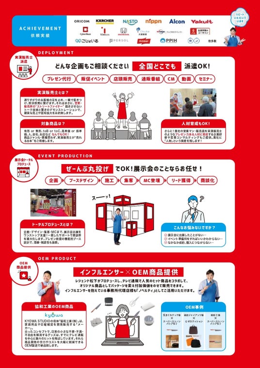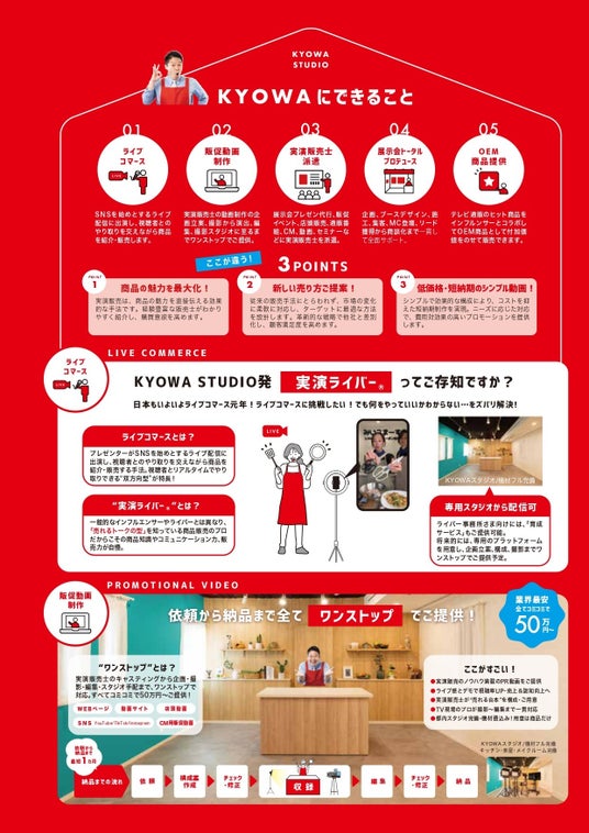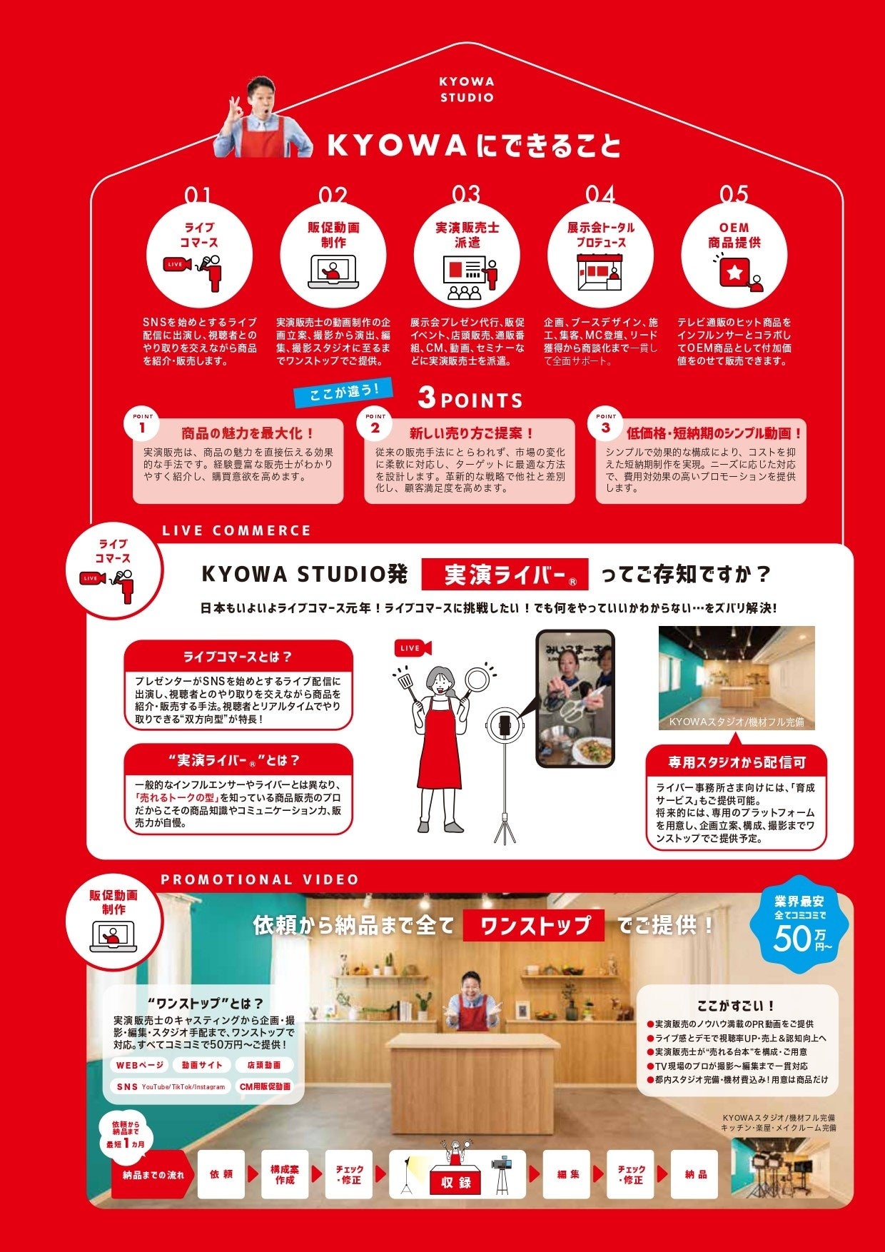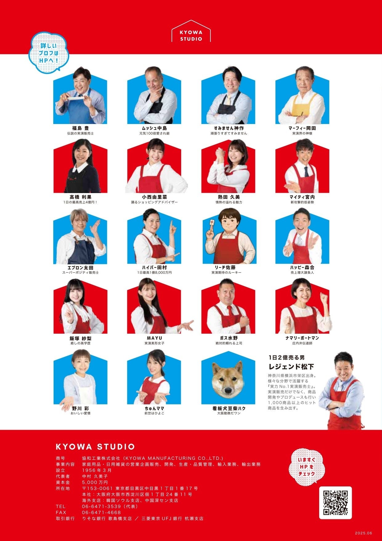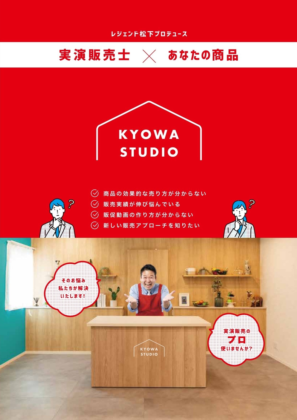 KYOWA STUDIOは、協和工業株式会社の実演販売事業部で、さまざまな商品やサービスの魅力をわかりやすくお伝えする、実演販売のプロフェッショナル集団です。