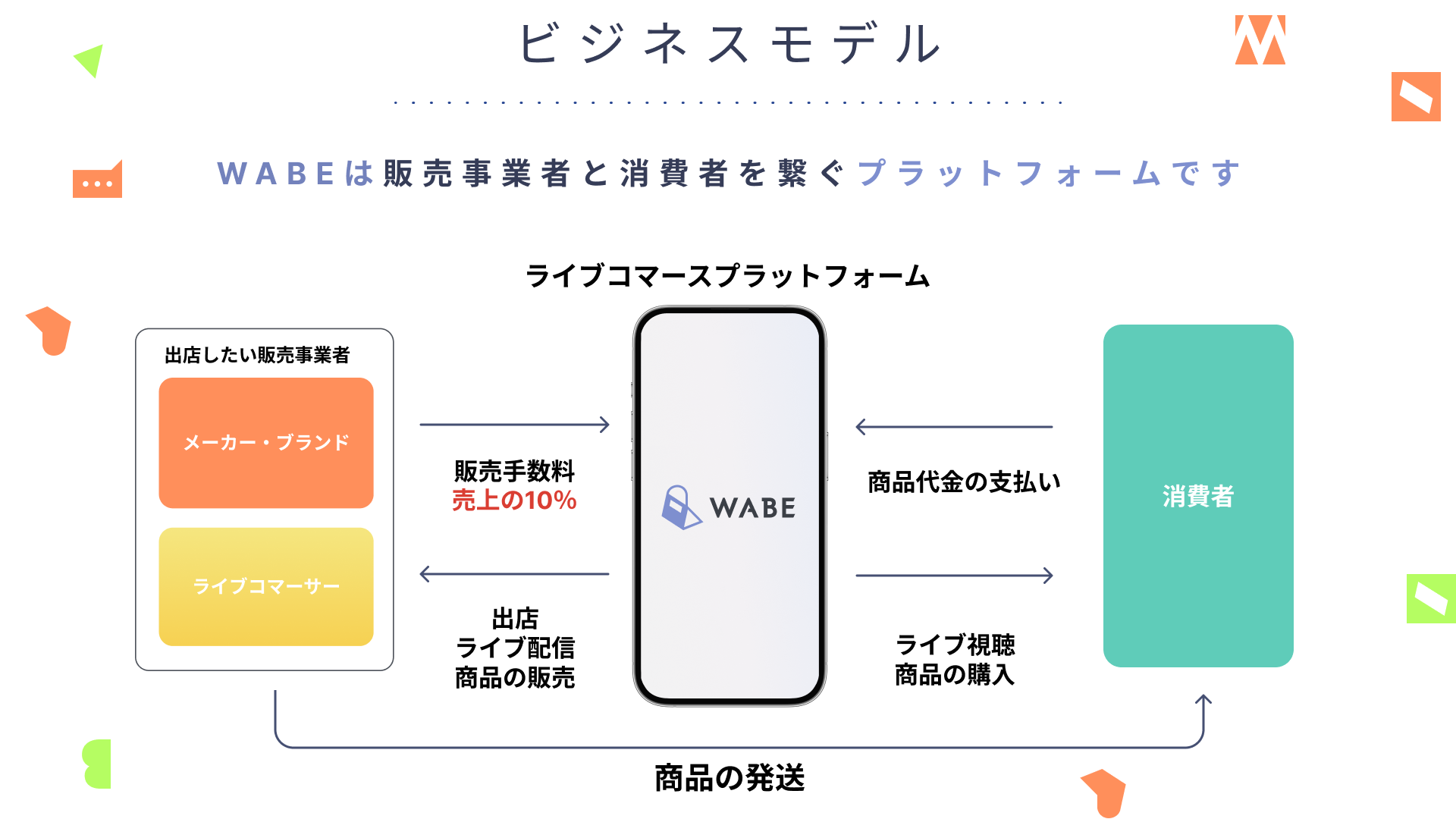 当社は、ライブコマースのインフラ化を目指すスタートアップ企業です。2017年から業界に参入し、ライブコマース専用のECモールアプリ「WABE」の開発・運営や、ライブコマーサーのプロデュースとマネジメントを行うライブコマース専門事務所「トキバナ」を展開しています。