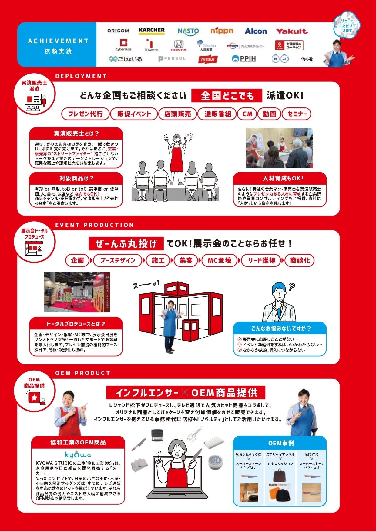 TV通販で数億円を売り上げる販売士、実演歴30年以上の大ベテランをはじめ、芸人、落語家、インフルエンサー、モデル、レポーター等、バラエティーに富んだ約30名が所属しております。