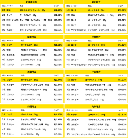 その他、全国ランキングでは、「じゃがりこ」が3位、「ポテトチップス」が4位、7位、8位、「アルフォート」が5位、「かっぱえびせん」が10位となりました。地方別ランキングにおいても、「じゃがりこ」と「ポテトチップス」は上位にランクインしている地方が多く、「スナック菓子」の需要の高さも明らかとなりました。さらに、地方別ランキングでは、北海道地方や東北地方などの東日本では「甘いもの」が上位に、四国地方や九州地方などの西日本では「しょっぱいもの」が上位になるなど、地方ごとに味の特色があることが分かりました。