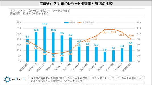 ドラッグストアに於ける、入浴剤カテゴリ商品のレシート1000枚あたりの出現数を気象庁発表の平均気温(東京都)と合わせて分析してみました。1年間で最も出現数の数値が大きいのは2023年12月の12.7となり、前後の2023年11月と2024年1月も10を超えています。一方で平均気温が25℃を超えている2024年7月~9月は出現率が5を下回っており、2024年7月が最も低く3.5となっています(図表6)。