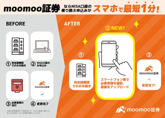 moomoo証券株式会社(ムームー、本社:東京都渋谷区、代表取締役社長:伊澤フランシスコ、以下「moomoo証券」)はこの度、ユーザー様のさらなる利便性の向上を図るため、NISA口座の金融機関変更手続きを簡略化させ、お申し込みがウェブ上で最短1分(※1)で完結できるようになったことをお知らせいたします。面倒な入力作業なしで、より簡単かつ迅速に乗り換え手続きを行うことが可能となりました。