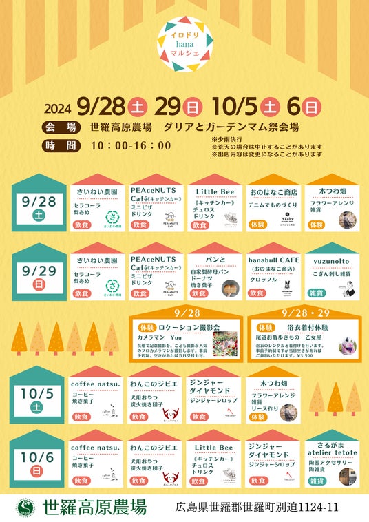 世羅高原農場では現在、「ダリアとガーデンマム祭」を開園しています。期間中4日間限定でマルシェを開催します。地元世羅町や近隣からグルメ、スイーツ、雑貨などが集まります。