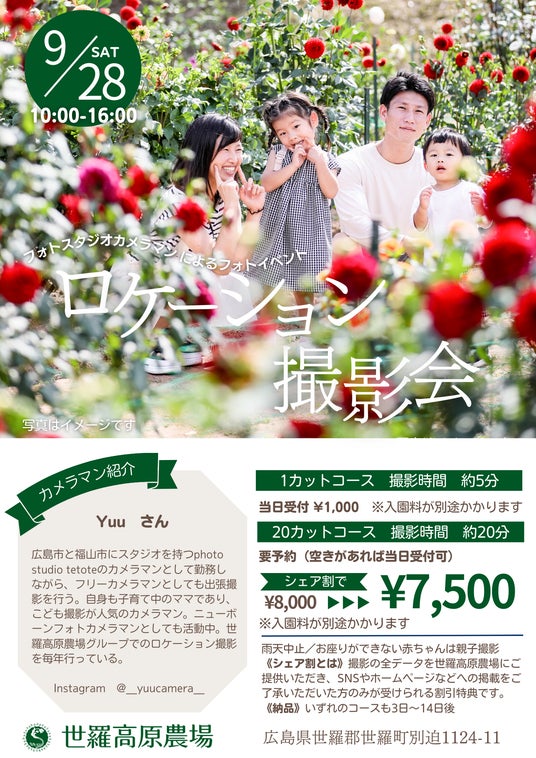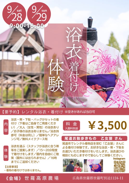また、浴衣の着付け体験やロケーション撮影会なども予定しています。過ごしやすくなった秋の世羅高原農場で花風景を満喫していただくイベントを開催します。