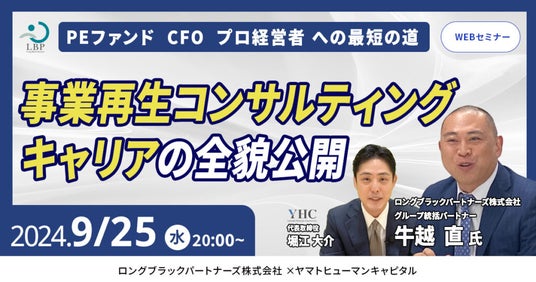ヤマトヒューマンキャピタル株式会社(本社:東京都千代田区、代表取締役:堀江 大介)は、2024年9月25日(水)20:00よりオンラインにて、ロングブラックパートナーズ株式会社のグループ統括パートナー 牛越 直氏にご登壇いただくウェビナー『事業再生コンサルティングキャリアの全貌公開』を開催いたします。