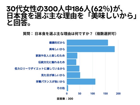 30代女性の300人を対象とした「日本食を選ぶ主な理由は何ですか?」というアンケートで186人(62%)が「美味しいから」という結果になりました。
