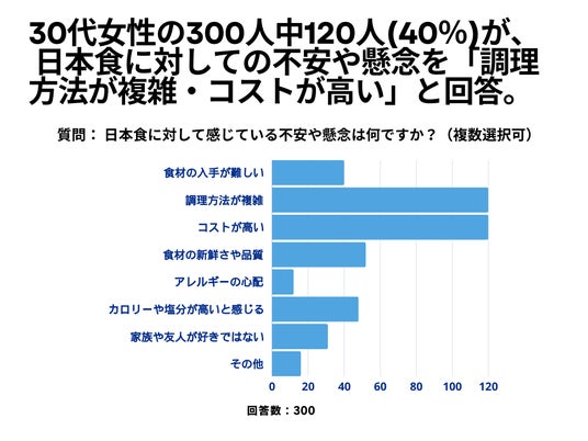 30代女性の300人を対象とした「日本食に対して感じている不安や懸念は何ですか?」というアンケートで120人(40%)が「調理方法が複雑・コストが高い」という結果になりました。