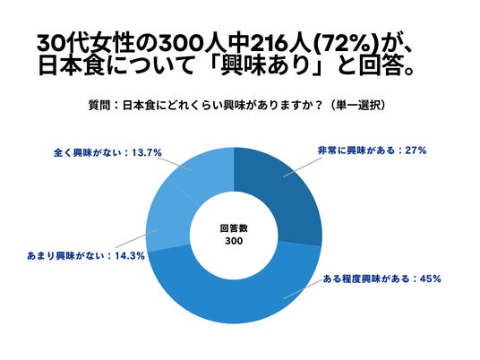 30代女性の300人を対象とした「日本食にどれくらい興味がありますか?」というアンケートで216人(72%)が「日本食について興味あり」という結果になりました。