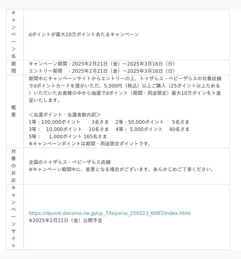 株式会社NTTドコモ(以下、ドコモ)は、トイザらス・ベビーザらスの対象店舗※1において「dポイント最大10万ポイントあたるキャンペーン」(以下、本キャンペーン)を2025年2月21日(金)から2025年3月16日(日)までの期間で開催いたします。