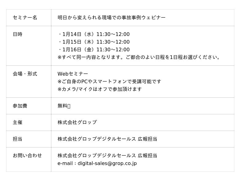 そんな課題に応えるため、株式会社グロップが現場の安全衛生を徹底サポートするウェビナーを開催します。このウェビナーでは、最新の事故事例をもとに、事故防止のための具体的なポイントや即活用できるノウハウを詳しく解説します。現場の安全に関する新しい視点を取り入れ、より強固な対策を構築する絶好の機会です!