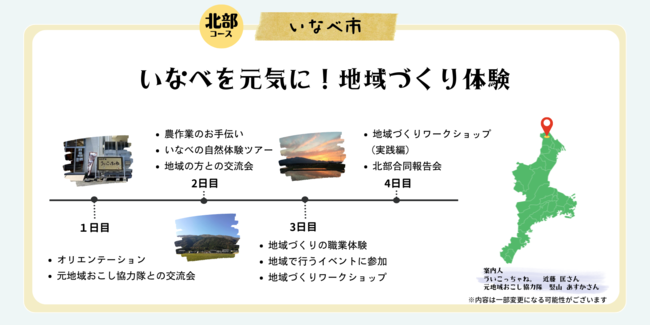廃校をリノベーションしてカフェとあそび場を作った、いなべ市の地域おこし協力隊。退任後も地域で続けている活動に参加することで、地域づくりの現場を体験し、地域とのかかわり方や、地域づくりのやりがい、難しさなどについて、元地域おこし協力隊から直接学びます。