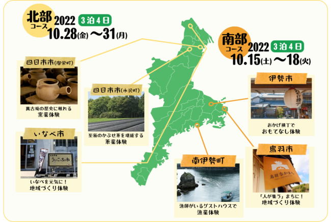 三重県の6つの地域において、地域づくりや農業・漁業・窯業・観光業など、三重県ならではの「しごと」を体験するとともに、そこで暮らしている先輩移住者や、地域の方々とつながり交流をする3泊4日のプログラムを実施します。