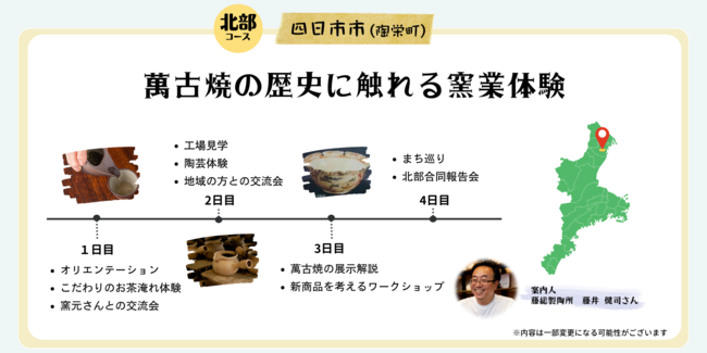 300年以上の歴史を誇る萬古(ばんこ)焼について、窯元訪問や陶芸体験などを通して、作り手である職人の方をはじめ、販売にかかわる売り手の方や、飲食店などの使い手の方まで、萬古焼にかかわる人々の想いに触れ、窯業の魅力を知る体験プログラムです。