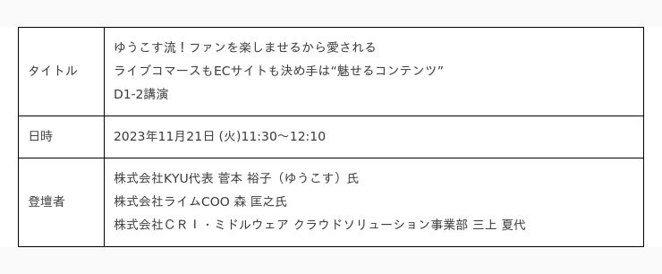 「ネットショップ担当者フォーラム 2023 秋」は、株式会社インプレスが主催するイーコマース市場、流通市場の現状と課題を読み解き、その方策を導く、EC事業者・インターネットショップ担当者向けのコンファレンスです。弊社が登壇する本セッション「ゆうこす流!ファンを楽しませるから愛される、ライブコマースもECサイトも決め手は“魅せるコンテンツ”」には、ライブコマースの第一人者として活躍中で、インフルエンサー“ゆうこす”としても絶大な影響力を持つ株式会社KYU代表 菅本 裕子氏(以下、ゆうこす氏)と、ファッションを中心としたさまざまな企業のECビジネスに数多くのソリューションを提供してきた株式会社ライムCOO 森 匡之氏を迎えてお話を伺います。