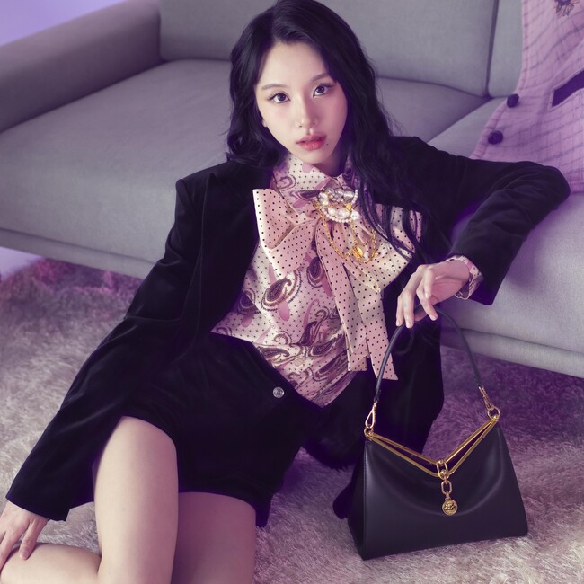 チェヨンが纏うのは、フラワーモチーフの刺繡をあしらったくるみボタンが印象的なブラックベルベットのセットアップに、2023秋冬コレクションのランウェイに登場した新しいペイズリー柄が特徴のシルクシャツ。アクセサリーにはパールやチェーンなど異なる素材が幾重にも重なるネックレスと、シルクシャツと同じ柄のビッグボウタイが高級感を漂わせます。アイコンバッグ「ヴェラ」を合わせ、シックなコーディネートを披露しています。
