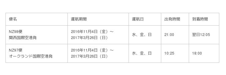 関空からニュージーランド・オークランドへの直行便は週3便の季節便で、ニュージーランドの夏季にあたる2016年11月4日から2017年3月26日にかけてボーイング767-300機で運航されます。