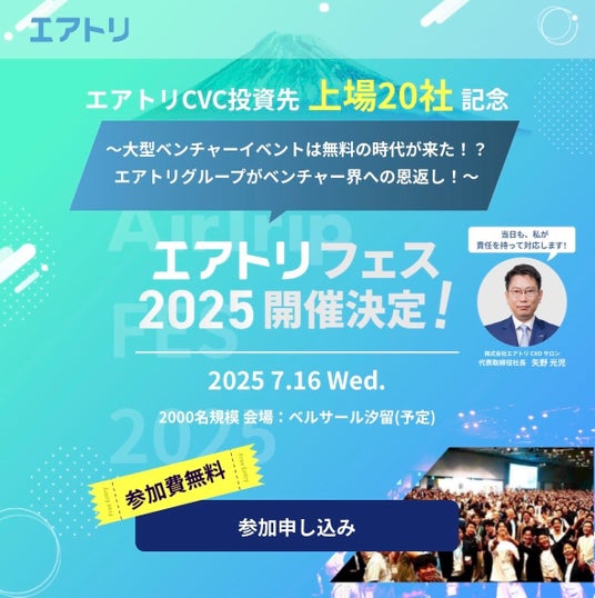~エアトリCVC投資先上場20社記念イベント~2025年7月16日(水)にベルサール汐留で「エアトリフェス2025」をトークセッション・交流会を含め、全員ご招待で開催が決定!~「大型ベンチャーイベントは無料の時代が来た!?」ベンチャー起業家、スタートアップ起業家、学生起業家・学生の方も、トークセッション・交流会を含め、全員ご招待!エアトリCVC投資先上場20社の代表者も、多数登壇予定!~2024年9月期の取扱高1,235億円、営業利益36.2億円、エアトリCVC投資先上場20社の実績があるエアトリグループから、その経験や・知見を活かし、「ベンチャー界への恩返し!」~~将来的には年2回の開催を目指し、日本一のベンチャーイベントを目指す~※フェスの高い質を担保するため、参加をお断りする場合もございます。予めご理解のうえ、お申し込みください。