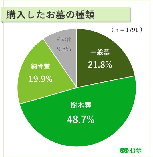 - 購入したお墓の種類は「樹木葬」が48.7%で前回の調査に引き続き約半数― 次いで一般墓21.8%、納骨堂19.9%