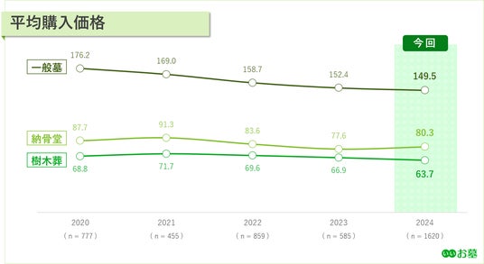3. 平均購入金額は、一般墓は微減、樹木葬と納骨堂は横ばい― 一般墓149.5万円、樹木葬63.7万円、納骨堂80.3万円