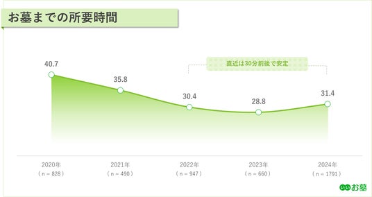 - 自宅からお墓までの所要時間の平均は31.4分― ここ3年は30分前後で安定、手段は車が最多だが都内在住者は公共交通機関の利用も多い