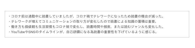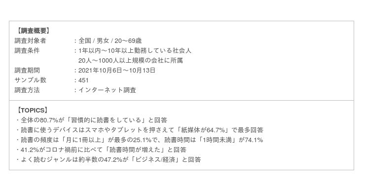 昨今の社会情勢に伴った社会人の価値観や生活習慣の変化から、読書時間や頻度及び読むジャンルなどにも変化をもたらしています。このことから今後もwithコロナ、アフターコロナで、社会人の読書実態に変化があることが予測されます。