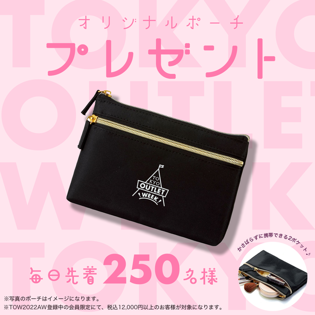 会場で¥12,000円(税込)以上購入で各日先着250名様に「TOKYO OUTLET WEEKオリジナルポーチ」(非売品)をプレゼント!