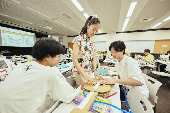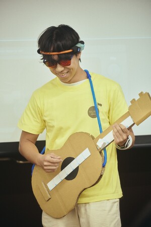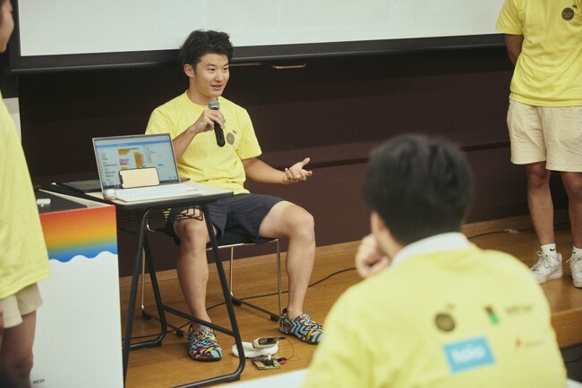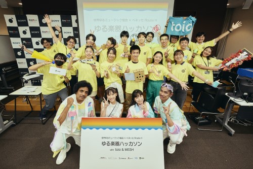 そんな世界ゆるミュージック協会はこれまで2021年東京にて、2022年大阪にて「ゆる楽器ハッカソン」が、2023年にはインドにて「ゆる楽器アイデアソン&ハッカソン」が開催され、たくさんのゆる楽器を開発してきました。優勝した楽器「ハーモニーフラッグ」は日々改良が加えられ現役ゆる楽器として活躍しています。その「ゆる楽器ハッカソン」が今回初めて、中学生、高校生を対象とした「ゆる楽器ハッカソンwith toio & MESH」として2023年8月19日(土)~20日(日)の二日間にかけて開催されました。本ハッカソンは株式会社ソニー・ミュージックエンタテインメントとRoute H(※)によるもので、またTEAM EXPO 2025/共創チャレンジの第4弾として、全国から中高生が集まり「ゆる楽器」を開発しました。2日間で様々なコンセプトのゆる楽器が誕生し、ハッカソンの最後にはそれぞれが作った楽器を身に着け、「満ちる愛・繋ぐ夢」を全員で合奏し、大変盛り上がりました。