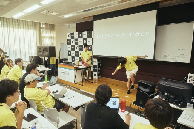 開催概要:全国から中高生を対象に参加者を募集。当日チームを結成して、ソニーのアイデアを形にできるIoTブロック「MESH (TM)(メッシュ)」、ロボットトイ「toio (TM)(トイオ)」を使用し、誰もがすぐに弾けて合奏できる「ゆる楽器」を開発しました。