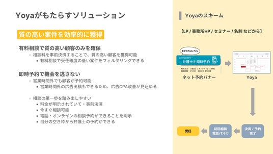 Yoyaのソリューションではユーザーはより気軽に法律相談の予約ができ、法律事務所はより質の高い案件を効率的に獲得することができるようになります。