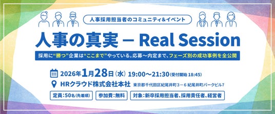 企業の採用力強化を支援するHRクラウド株式会社(本社:東京都千代田区、代表取締役社長:中島 悠揮、以下「当社」)は、2026年1月28日(水曜日)、採用担当者向けオフラインイベント「人事の真実- Real Session」を開催いたします。今回のテーマは『採用に”勝てる”企業は“ここまで”やっている。応募~内定まで、フェーズ別の成功事例を全公開』です。