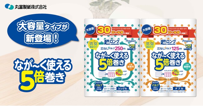 丸富製紙株式会社(本社:静岡県富士市、代表取締役社長:佐野武男)は、超長尺トイレットペーパー「ペンギン 超ロング」シリーズより、「ペンギン 芯なし超ロング5倍巻きトイレットペーパー(6ロールタイプ) シングル・ダブル」を、2022年12月1日(木)に新発売いたします。