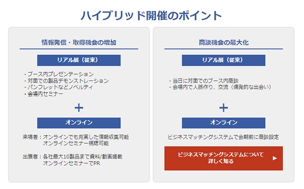 昨年に引き続き、リアル・オンラインのハイブリッド型の展示会として開催します。ビジネスマッチングシステムはWithコロナ時代の展示会への参加ニーズに応え、オンラインで時間と場所の制限がない商談やコミュニケーションが可能です。またイベントプラットフォームの出展者向けのサービスとして、出展者の製品資料や動画を来場者が閲覧する際に、目的(面談希望、購入検討中、情報収集)を尋ねるワンクリックアンケートを行い、出展者の営業フォローの優先順位を見える化しました。さらに、オンライン上の製品ページの重要度が増す中、前回の出展製品を読み込む機能を追加。出展担当者の手間と時間を削減し、出展者にやさしいサービスを提供します。