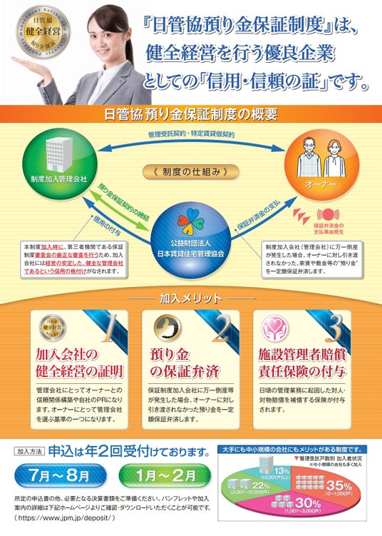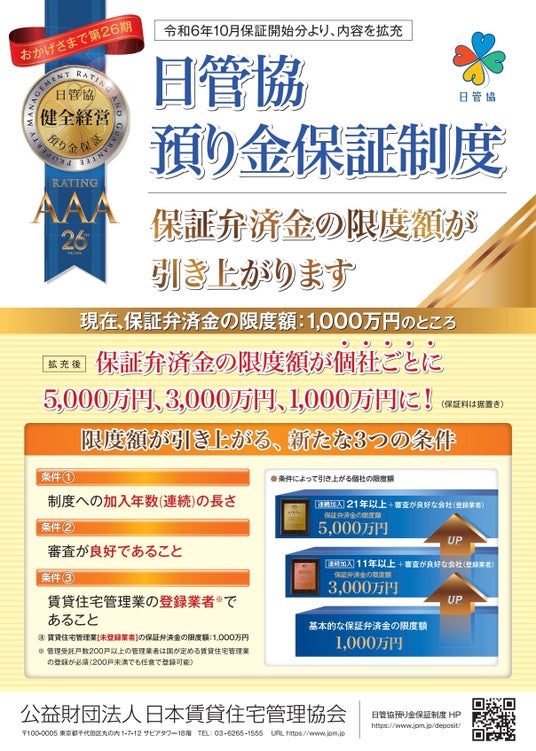 公益財団法人日本賃貸住宅管理協会(本部:東京都千代田区、会長:塩見紀昭、以下:日管協)は、「日管協預り金保証制度(以下、本制度)」の【保証弁済金の限度額を最大5,000万円まで引き上げる制度拡充(要件あり)】を行い、健全に経営を行っている加入者がメリットを享受できる保証内容いたしました。(詳細は以下リーフレット参照)