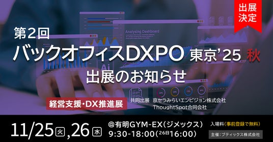 京セラみらいエンビジョン株式会社(本社:東京都港区、代表取締役社長:金炯培)は2025年11月25日(火)、26日(水)に有明GYM-EX(ジメックス)で開催される「第2回 バックオフィスDXPO 東京'25 秋」に出展します。